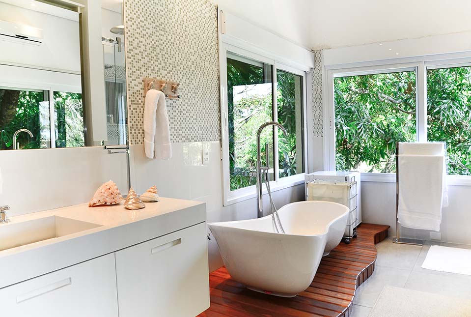Sinta-se parte da natureza na suíte master da CasaResort. Um espaço calmo, agradável e elegante ao seu dispor. Desfrute da bela banheira de imersão contemplando o mar. Rica em detalhes acolhedores, permita-se relaxar nesse santuário privado.